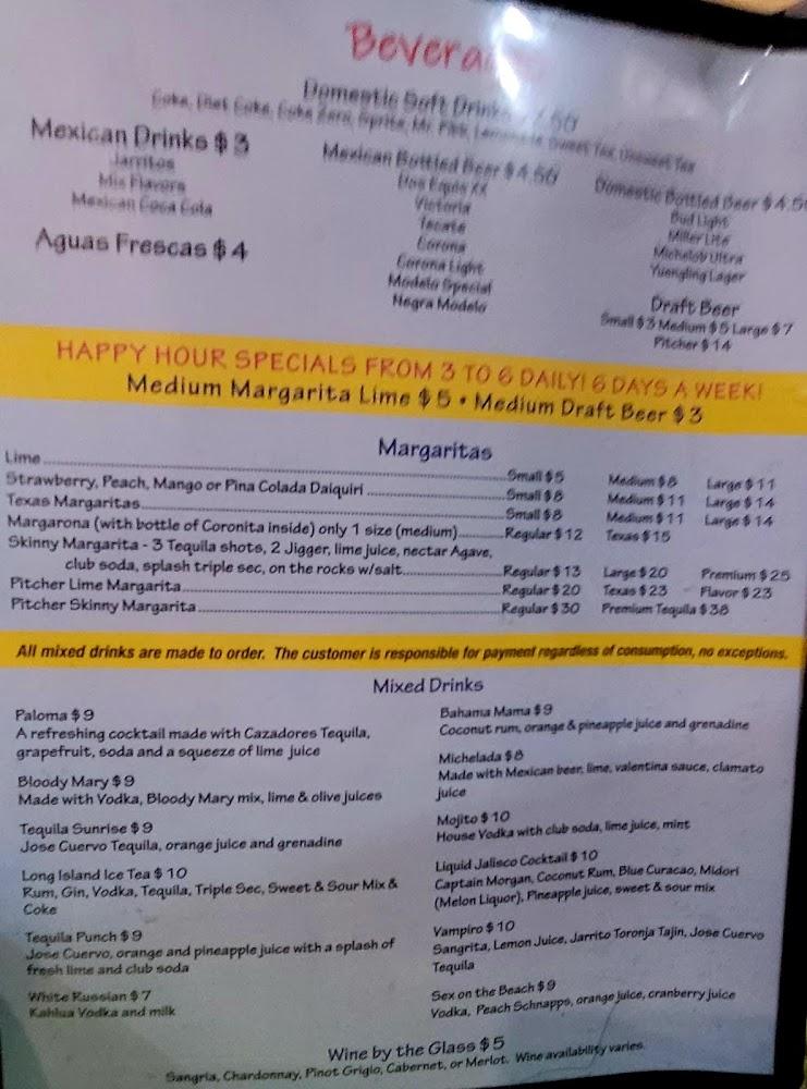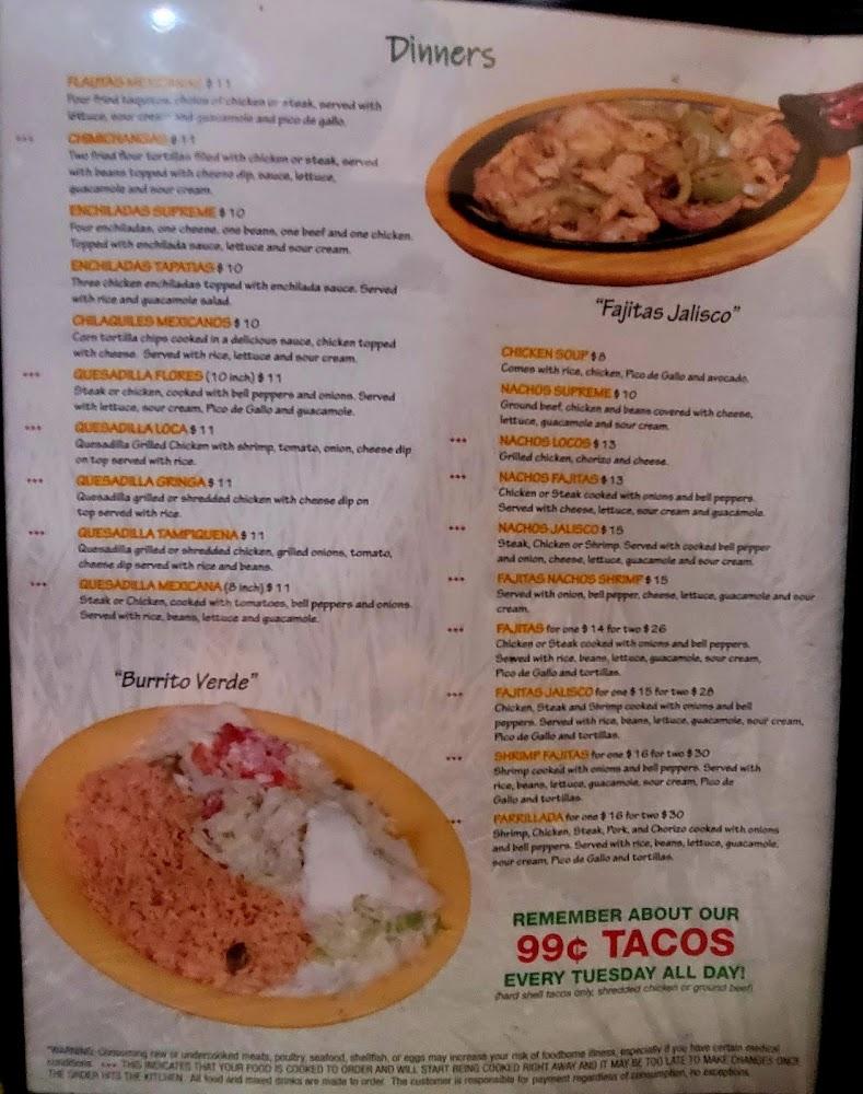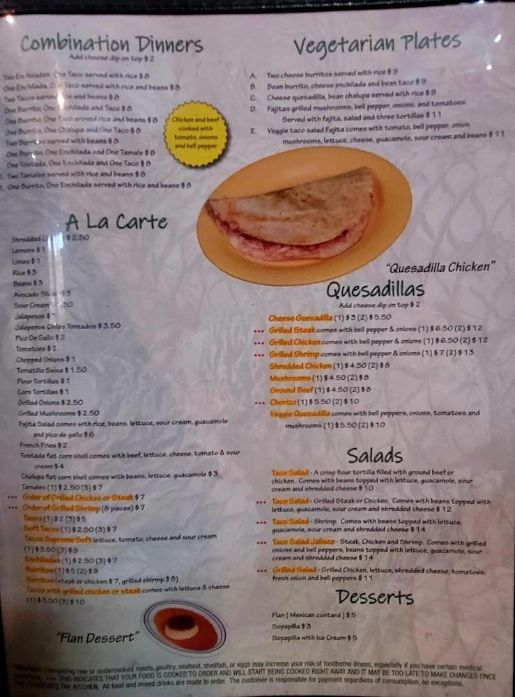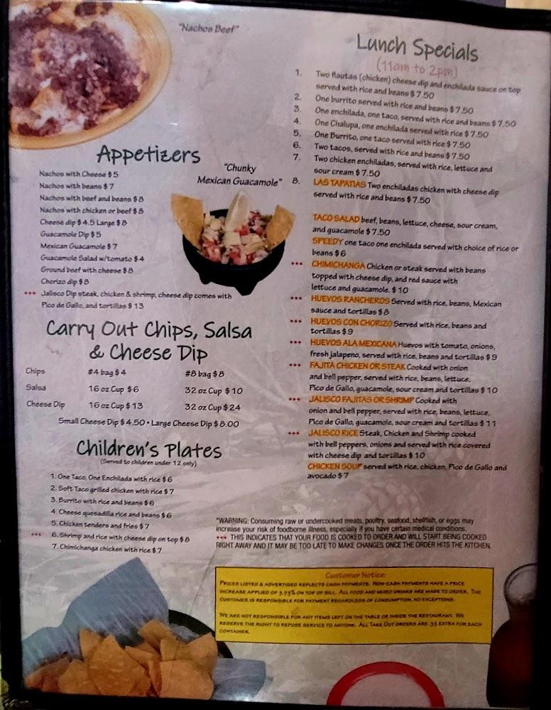 The menu at Jalisco Mexican Grill is diverse, appealing to many tastes. Appetizers like nachos with cheese and Mexican guacamole set the stage for delicious meals. Tacos and enchiladas dominate the lunch specials, perfect for a quick bite. Vegetarian plates cater to those who prefer plant-based options. Fajitas are a highlight too, served with fresh vegetables and warm tortillas. Desserts such as flan and sopapilla provide a sweet finish. The drink menu features a variety of beers and cocktails, enhancing the overall experience. Prices range from affordable to moderate, making it easy to enjoy a meal without breaking the bank.